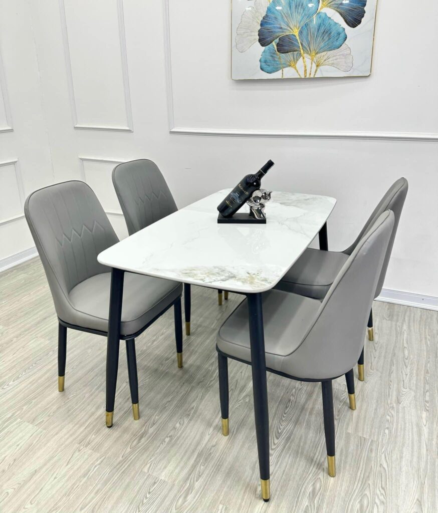 Bộ bàn ăn 4 ghế , chân côn , mặt đá ceramic, ghế camila nhập khẩu – GS013