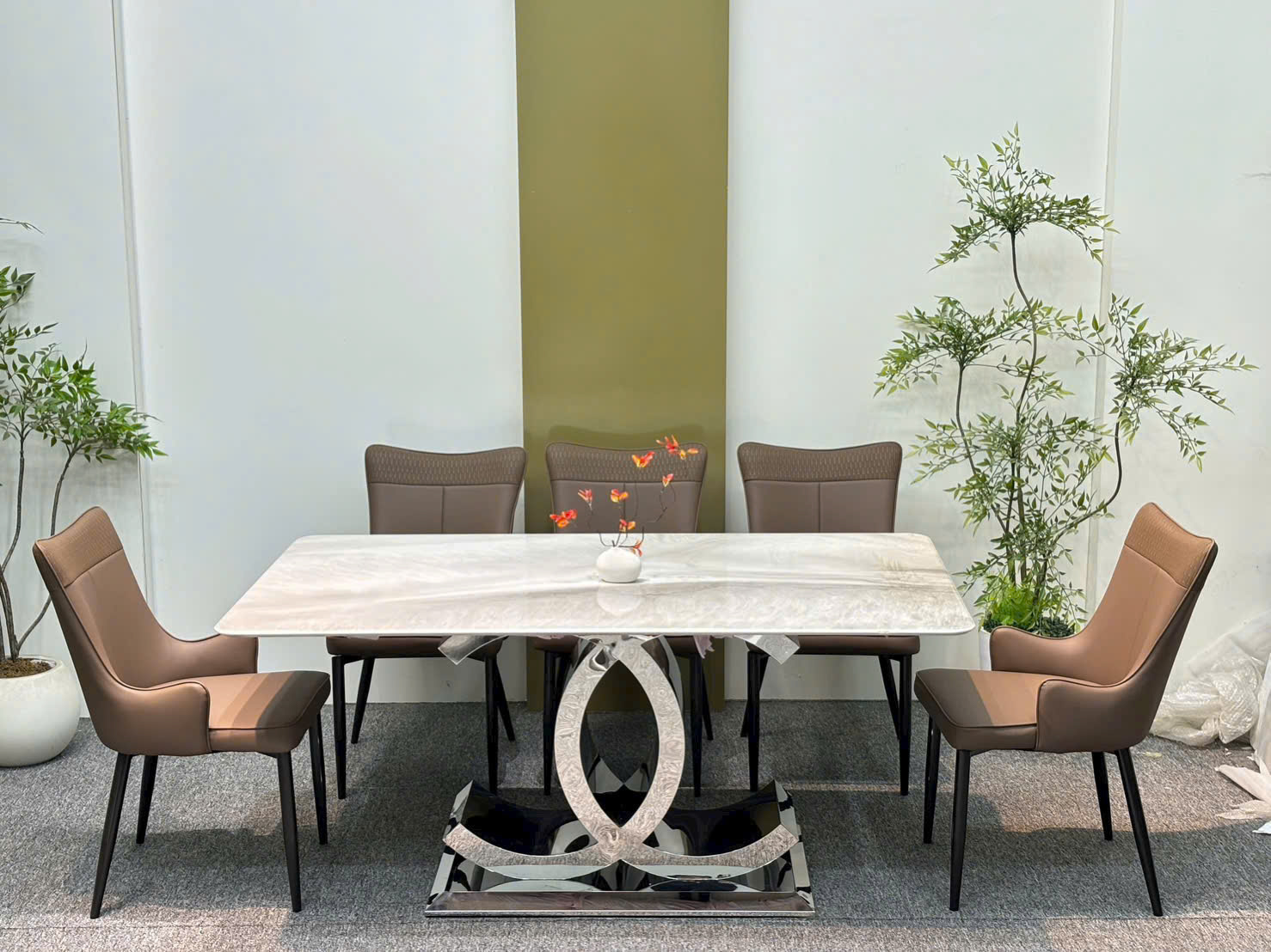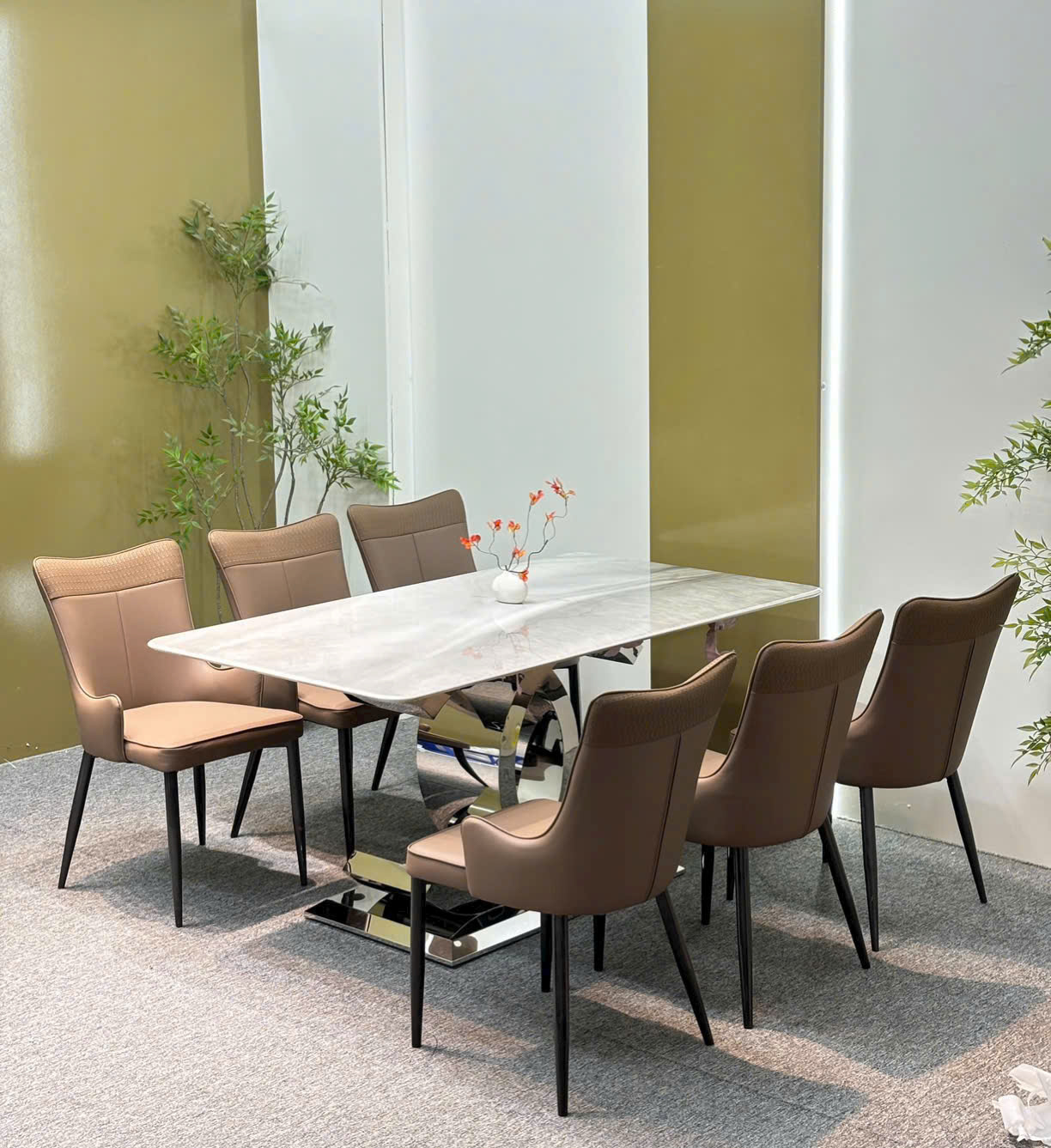 Bộ bàn ăn 6 ghế da nhập khẩu cao cấp, chân inox sáng bóng, mặt đá vi tinh thể – GS023