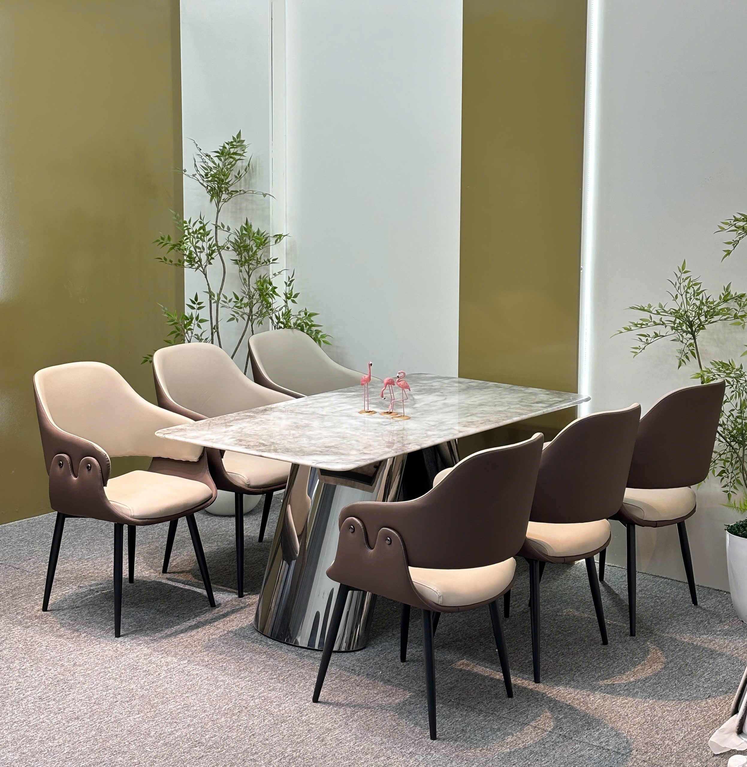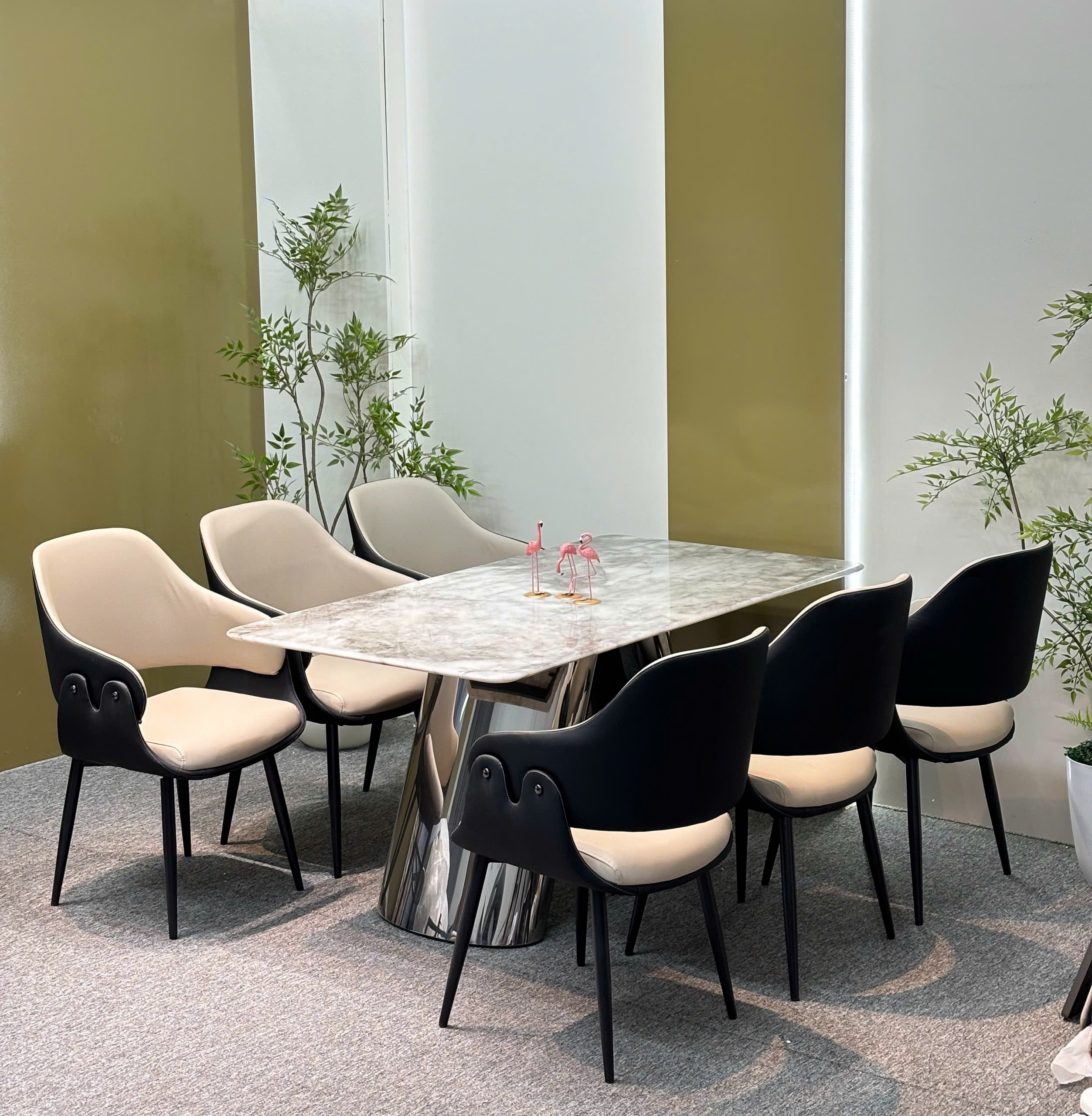 Bộ bàn ăn cao cấp 6 ghế , mặt đá vi tinh thể , chân bàn inox mạ titan – GS028