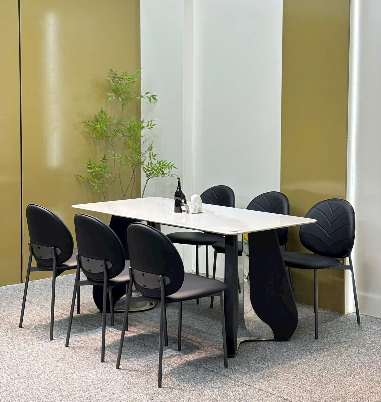 Bộ bàn ăn mặt đá vi tinh thể , chân bàn inox phối gỗ kết hợp cùng 6 ghế LÁ – GS025